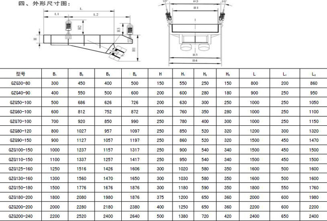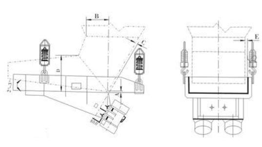 电机振动给料机设计时未考虑仓压的影响,为保证给料机的正常运行,必须尽量减少仓压对给料机的影响。因此在设计溜嘴时,应用溜嘴的后侧板承担料柱的垂直压力。溜嘴形式及配置尺寸可参考图及表中数值。