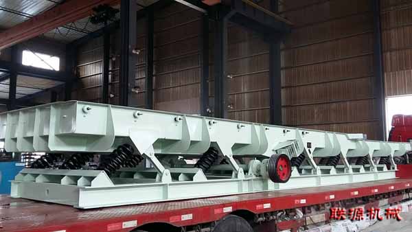 输送槽与底架之间用螺旋弹簧联接,该弹簧是主振弹簧,导向杆起输送槽振动导向作用,输送机运行中驱动机构使连杆端部作往复运动,而连杆通过其端部的螺旋弹簧带动输送槽作往复运动,使物料沿振动方向被连续抛起向前跳跃,达到输送物料的目的。