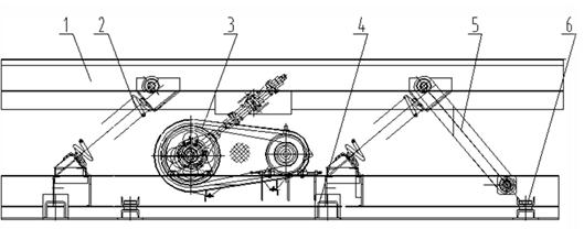 1输送槽、2主振弹簧、3驱动连杆机构、4底座、5导向杆、6辅助支座。