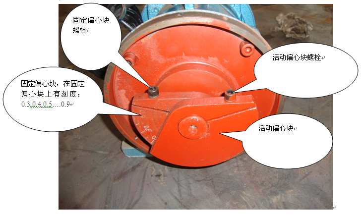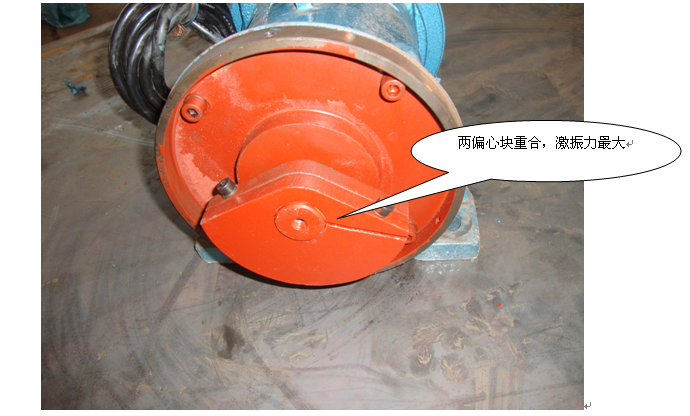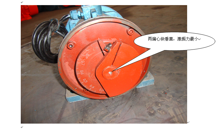 四:贵方可根据现场需要调整刻度达到贵方所需的激振力。调整时电机两端的偏心块要同时调整。当一端调整的夹角为0.8时,另一端也需要调到0.8。当完全调整好后,拧紧活动偏心块的固定螺栓。装上电机两端的罩壳后通电运行。