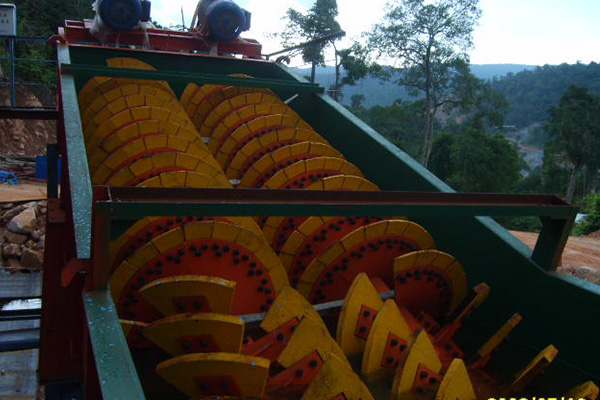 - 清洗:砂石从给料箱进入沉淀池,在转动着的螺旋叶片作用下,使砂石翻滚并相互研磨,除去覆盖砂石表面上的杂质,同时破坏包复砂粒的水汽层,以利于脱水。由多孔板进行的清洗水形成上升水流,将比重小的异物带到水面溢出堰外,完成清洗作用。