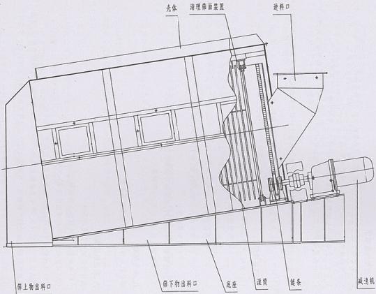 ??抛料式自清扫滚筒筛由壳体、筛筒、筛筒支架、减速机、减速机座几部分组成?;荡傻缍跛倩螅萋?,通过齿轮传动使筛筒旋转。PQG型抛料式自清扫滚筒筛的主体结构是筛分筒,整体与地平面呈倾斜状态,外部被密封隔离罩所密封,以防止污染环境。通过变速减速系统使筛分筒在一定转速下进行旋转,燃煤自上而下通过筛分筒得到分离,细料从筛分筒前端下部排出,粗料从筛分筒下端尾部。